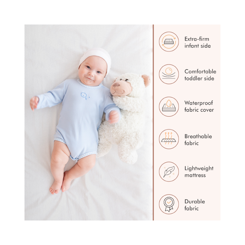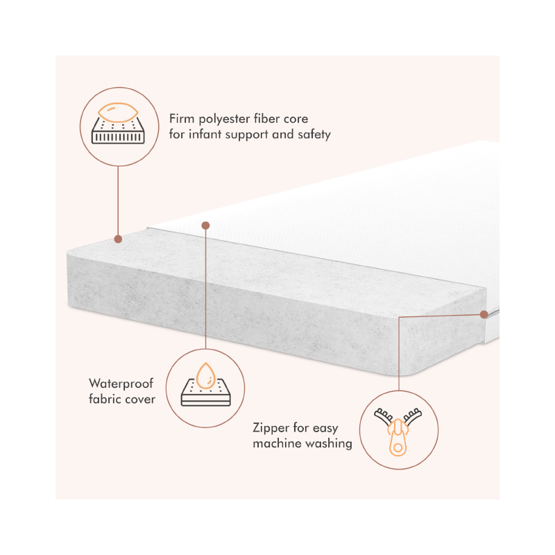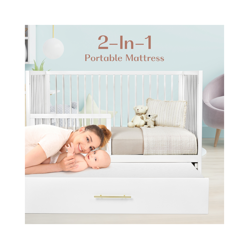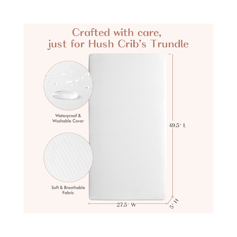 The Hushcrib Extra Firm Trundle Mattress is made of superior materials to ensure your child's comfort and safety. It features a quilted polyester, breathable, water-resistant cover that is removable & machine washable for your convivence. The mattress core is made of Bundle fiber, which has the resilience of the highest quality foam without any of the toxic emissions Creating a safe sleep environment for your little one.